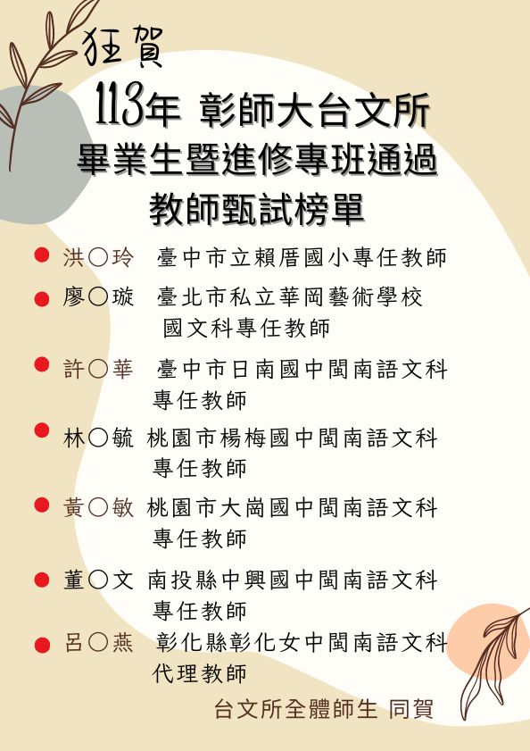 狂賀!!! 113年台文所畢業生暨進修專班通過教師甄試榜單