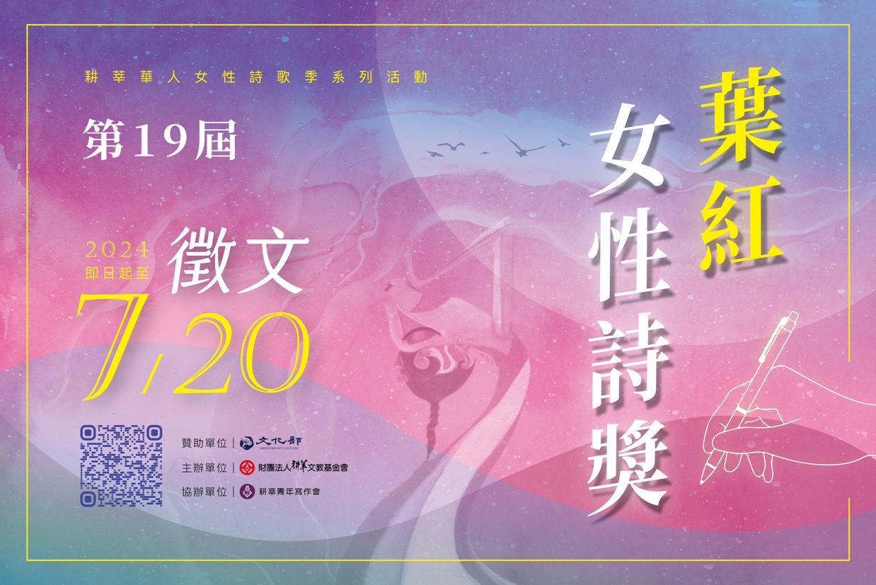 2024年第十九屆葉紅女性詩獎徵文起跑,以華文寫詩的女性均可參加,年齡不限。總獎金21萬元,歡迎投稿。
